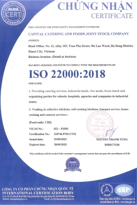 • Hệ thống quản lý chất lượng đạt chuẩn ISO 22000:2018HACCP. Nguồn nguyên liệu được tuyển chọn, tươi mới ngay trong ngày, yêu cầu nhà cung cấp thực phẩm có truy xuất nguồn gốc rõ ràng.