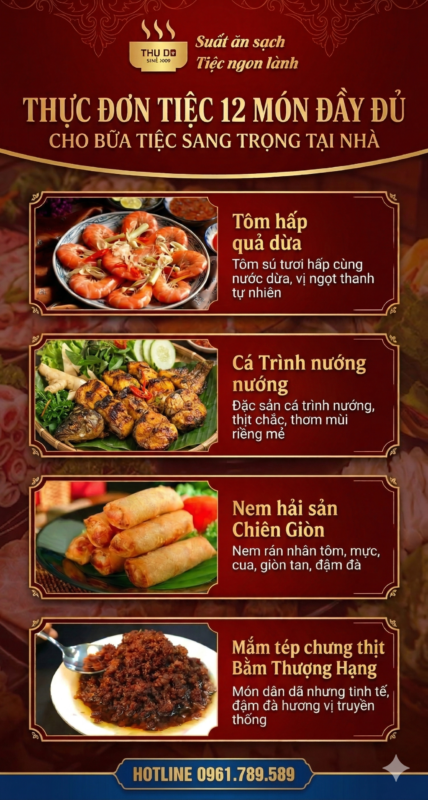 Nếu bạn đang tìm kiếm một thực đơn tiệc 12 món đầy đủ cho dịp trọng đại của gia đình, hãy tham khảo ngay thực đơn dưới đây. Và nếu bạn muốn xem thêm các lựa chọn khác, đừng bỏ qua bài viết gợi ý thực đơn tiệc 10 món dễ ăn – nơi chúng tôi tổng hợp những món quen thuộc được nhiều gia đình yêu thích.